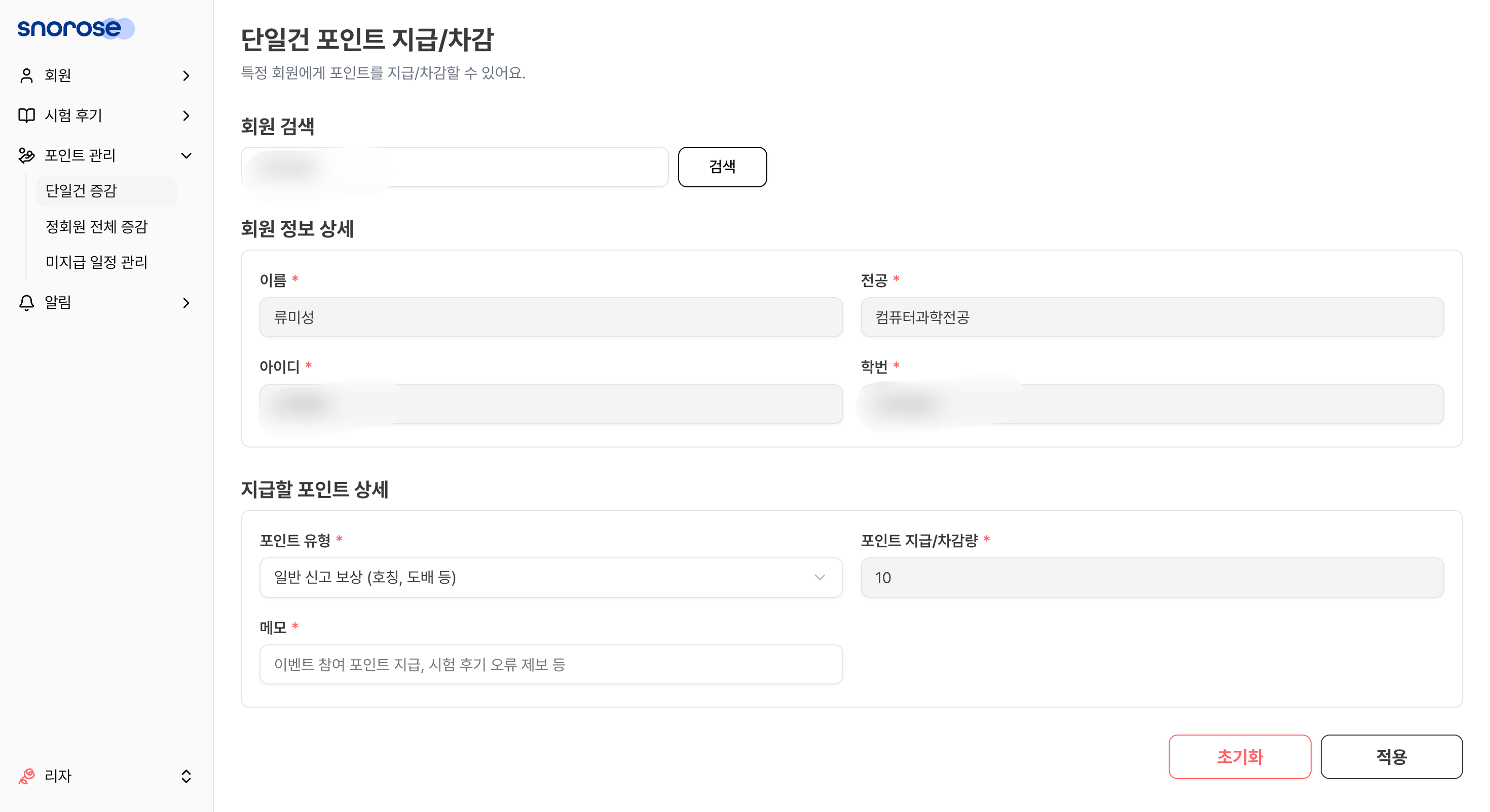 userId 조회(운영기획팀 → 백엔드에 조회 요청) 후 userId에 직접 입력userId를 조회해 sourceId에 직접 입력category, difference(포인트 증감량), source, memo를 모두 수동 입력이 과정이 반복되다 보니, 실수 가능성도 있었고 사용성도 좋지 않았습니다.