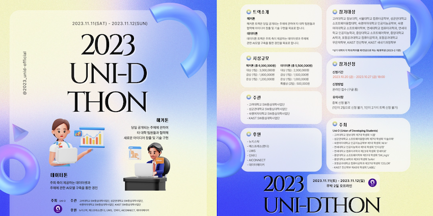 Union of Developing students의 약자로 고려대, 서울대, 성균관대, 숙명여대, 연세대, 중앙대, 포항공과대, 한국과학기술원 총 8개 대 학의 10개 SW 관련 단위 학생회 임원 연합 단체[대회 개요]