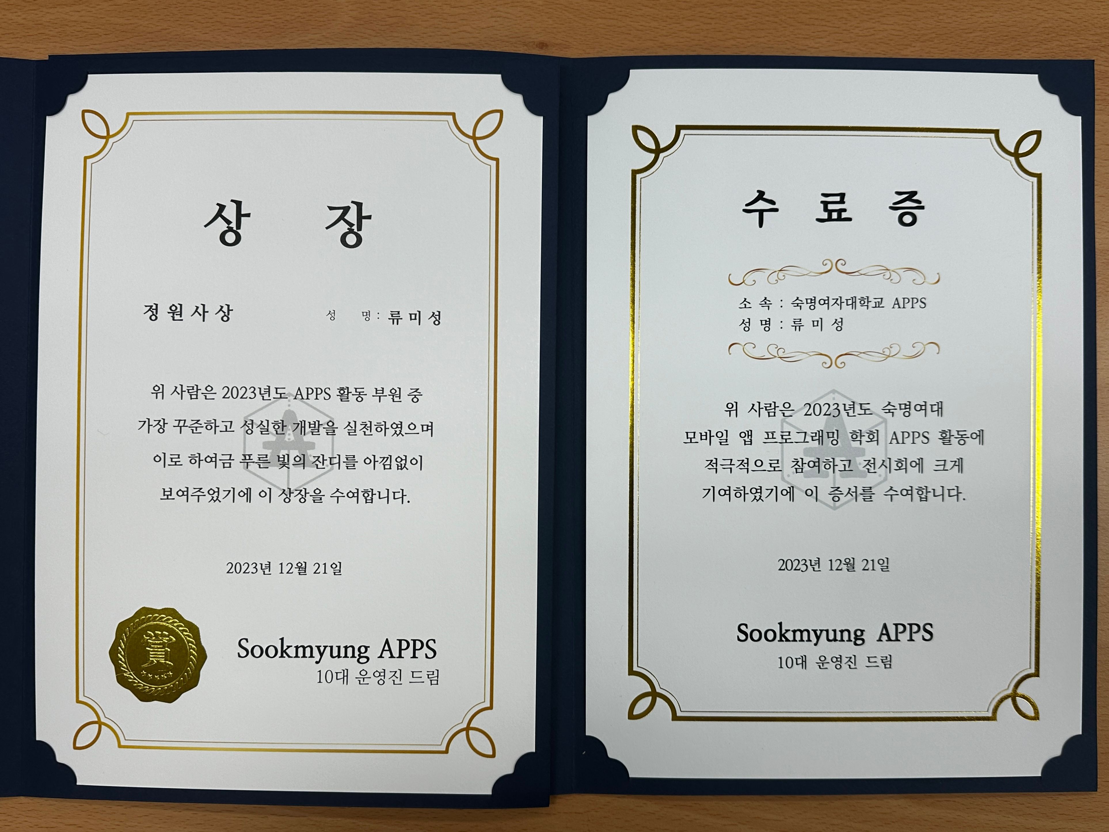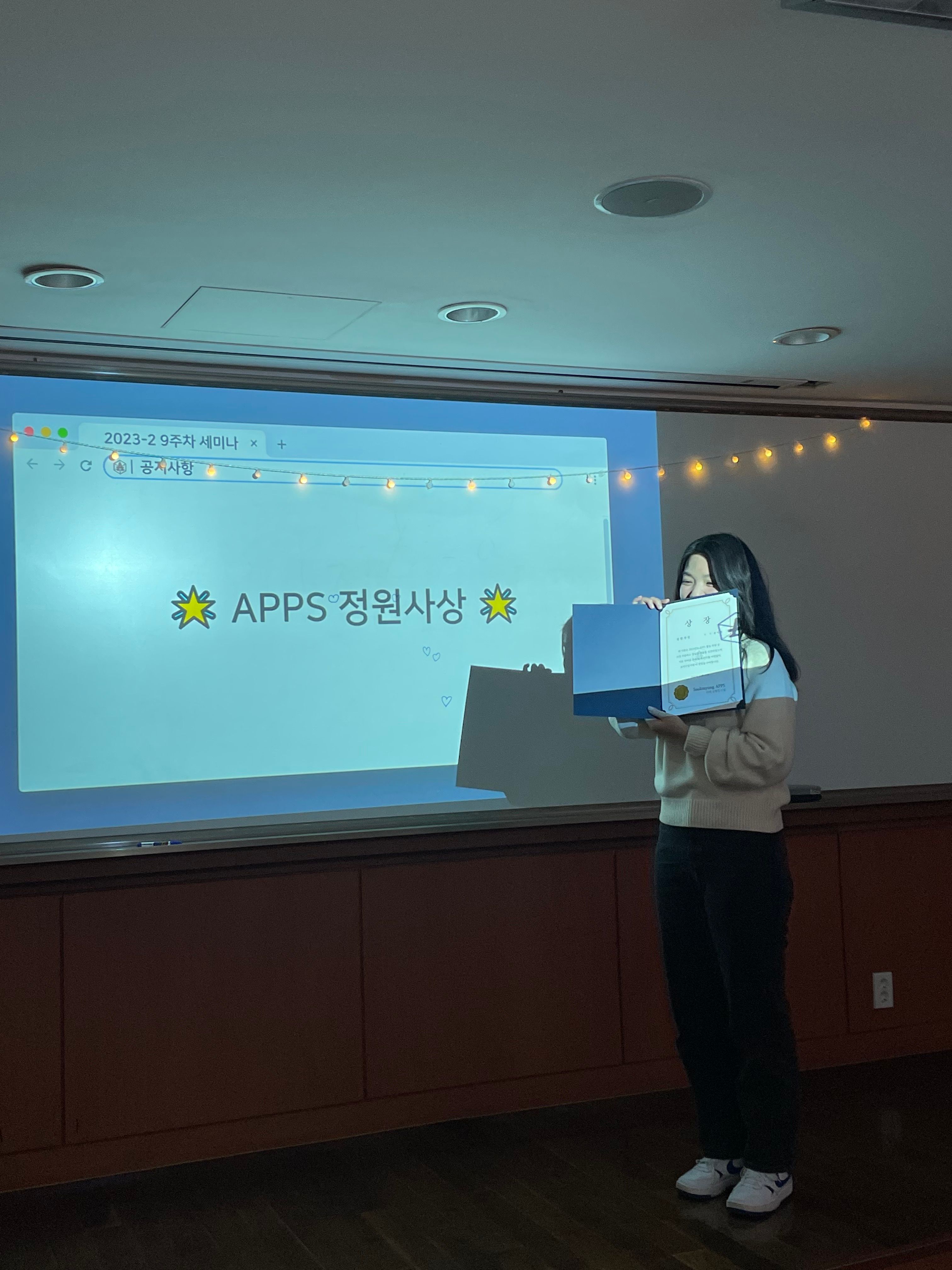 약 9개월 동안의 활동을 통해, 개발에 대해 전혀 몰랐던 내가 좋은 운영진과 학회원들을 만나 많은 성장을 이뤘다. 나 역시 누군가에게 긍정적인 자극을 주고 싶어 다음 해 운영진으로 활동하기로 결심했고, 2024년에는 프론트엔드장으로서 APPS 활동을 이어가게 되었다. 앞으로의 활동이 더욱 기대된다.