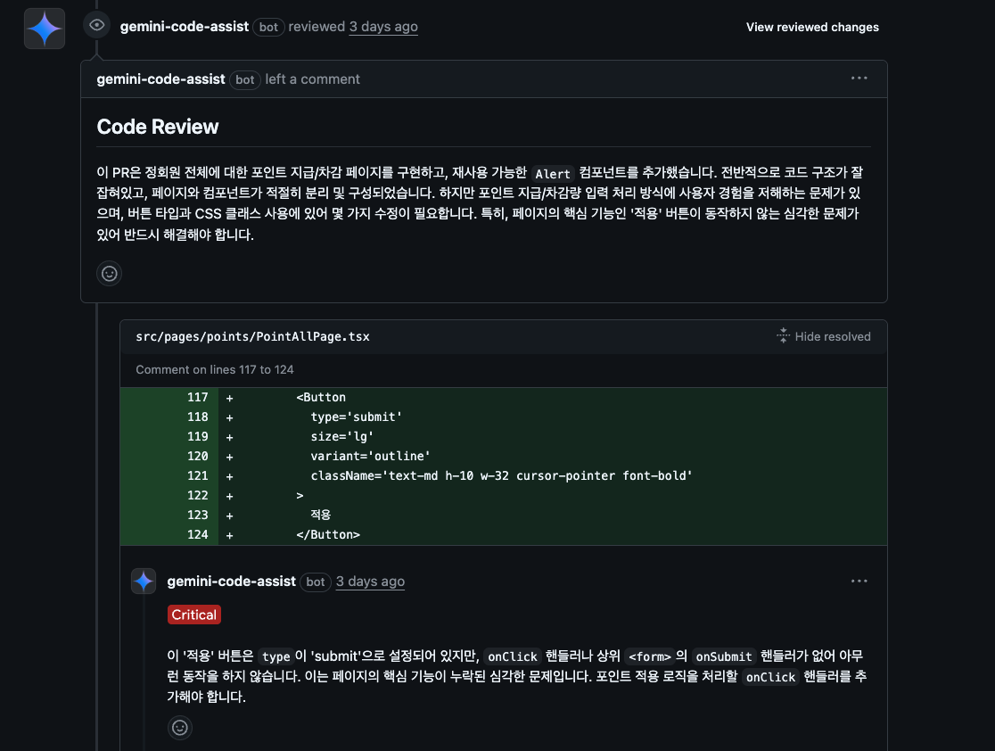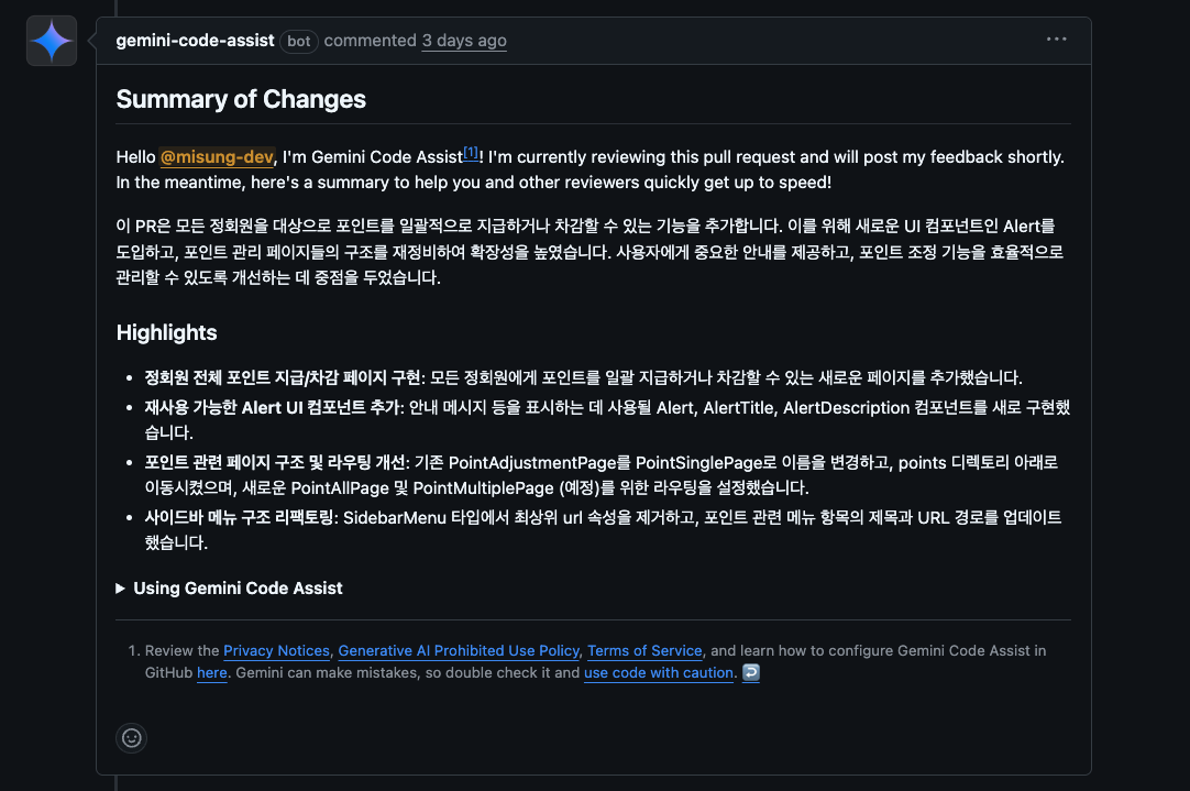 그러다 보니 자연스럽게 팀원 간 코드 리뷰 시간이 부족해지는 문제가 생겼고, 프론트엔드 팀에서 논의 끝에 AI 코드 리뷰를 도입해보자는 결론을 내렸어요. 최근 팀원이 설정해준 Gemini 기반 코드 리뷰를 사용해보니, 생각보다 리뷰 시간이 크게 줄어들어서 꽤 유용하다고 느꼈습니다.