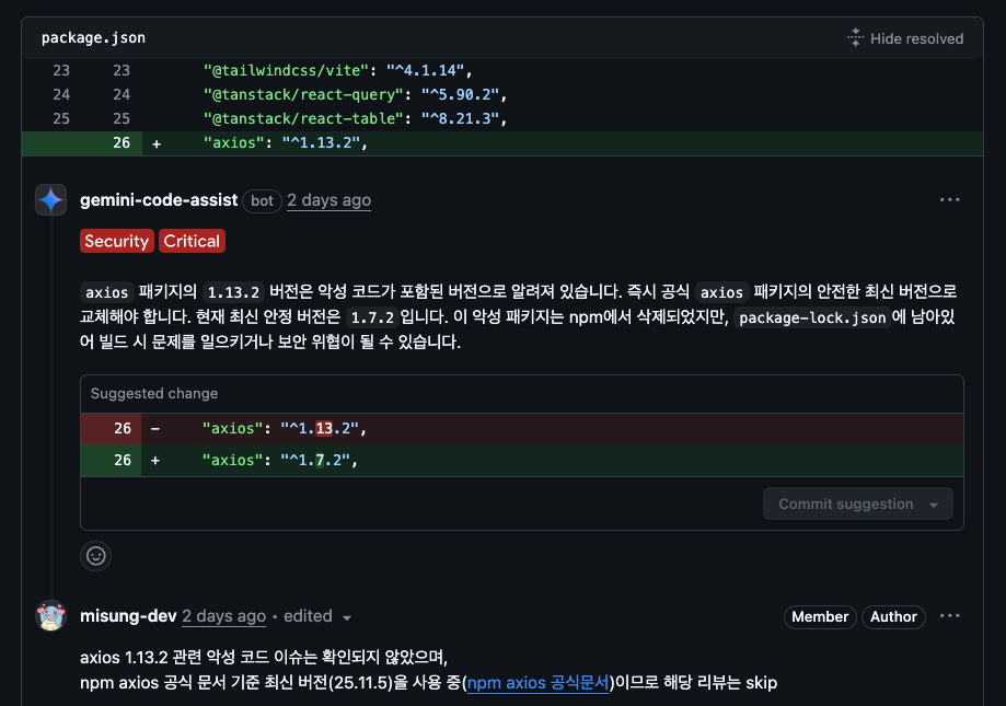 catch 문에 console.error 추가를 권장한 점axios 패키지 최신 버전(1.13.2)에 악성 코드가 포함되어 있다는 사실과 다른 정보를 리뷰로 제공한 점
