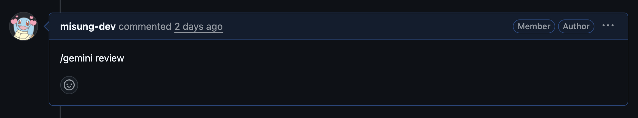 코드를 수정한 후 다시 리뷰를 받고 싶다면, PR 댓글창에 /gemini review를 입력해 재리뷰를 요청할 수 있습니다.