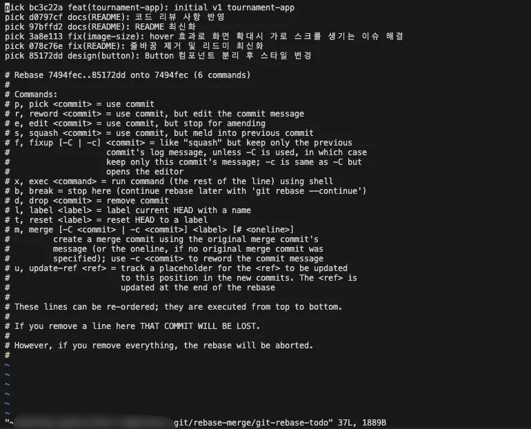 git rebase -i origin/mainorigin/main 이후에 추가된 모든 커밋 목록이 터미널에 나타남