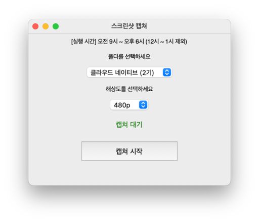 Python과정명_기수_날짜_YYMMDDHHMM.png와 같은 형태로 파일명이 지정ImageGrab.grab(): 화면 캡처, 자동화time: 시간 처리, 대기os: 파일 및 디렉토리 관리filedialog: 폴더 선택 dialog를 띄우고, 선택된 경로 반환PyInstaller: 독립 실행 파일 생성pydrive: 구글 드라이브 업로드캡쳐 대기 상태로 시작.캡쳐 시작 버튼을 클릭하거나, 운영 시간이 되면 자동으로 캡처 시작.캡쳐 대기 상태로 변경.캡쳐 중지 버튼을 클릭하면 즉시 중지.테스트를 위해 10초마다 화면을 캡쳐하고 로컬에 저장한다.